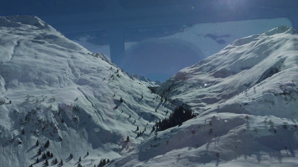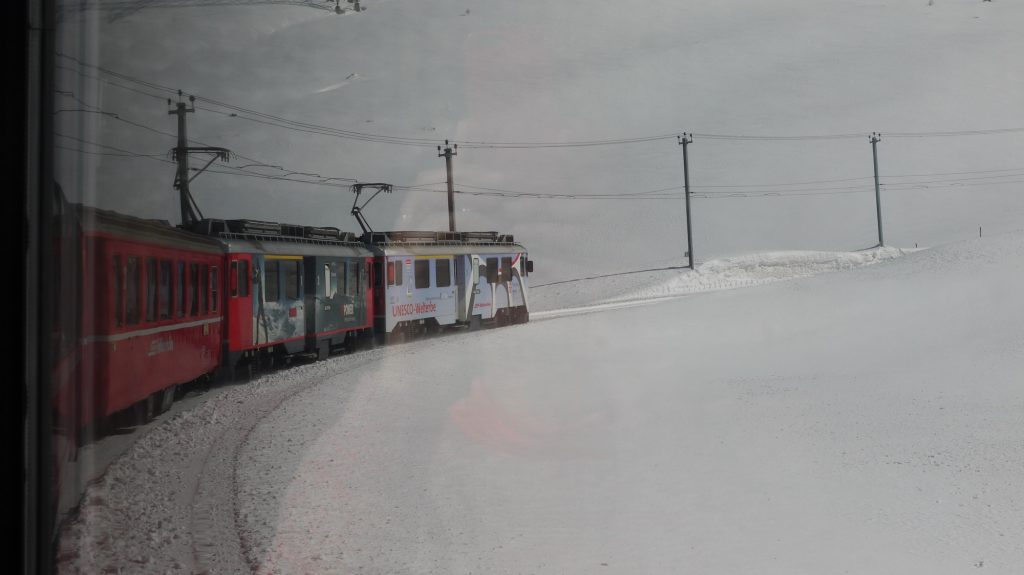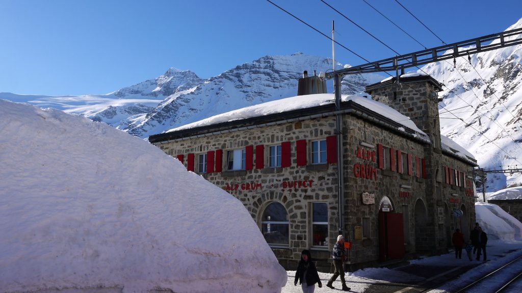 Tag 1 Bernina Express Samedan Fahrt zu Diavolezza Alp Grüm Albula Pass Kreisviadukt Brusio Tirano Proschiavo Alp Grüm aus der Sonne zurück in den Schnee Tag 2 Glacier Express Graubündner Platte Dissentis Oberalp Pass Zimmer mit Terrasse? und Matterhornblick unser Hotel Eisplatz in Zermatt Dorfmitte Zermatt Lawine über Zermatt